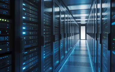 Illuminated futuristic server room hallway with rows of glowing blue server racks creating a sense of advanced technology and data processing