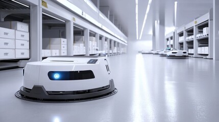 A futuristic warehouse featuring autonomous robots navigating aisles among storage units, showcasing advanced automation in logistics.