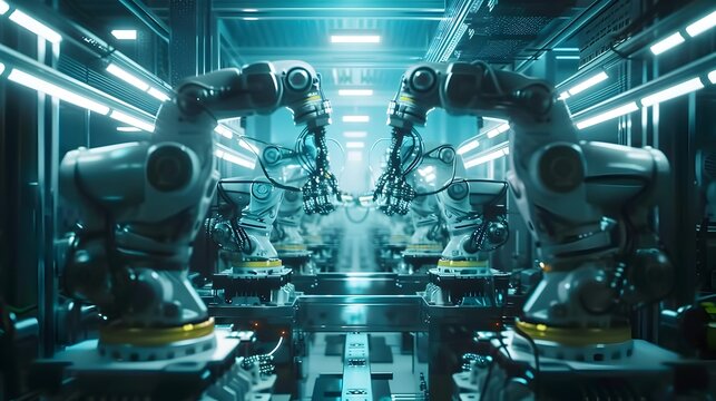 Futuristic Robots in Modern Warehouse Environment with Neon Lights