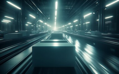 A futuristic warehouse scene featuring illuminated tracks and crates, conveying a sense of advanced technology and industrial efficiency.