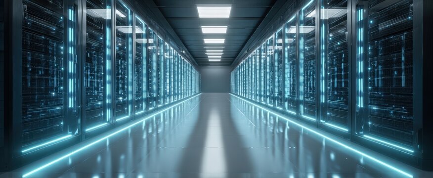 An extensive view of a modern server room bathed in blue neon lighting, symbolizing advanced technology, digital infrastructure, and the backbone of data connectivity.