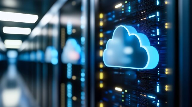Innovative cloud technology visualization with glowing icons representing data storage in a modern server room : Generative AI