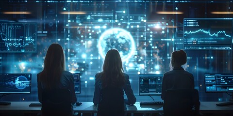 Team of professionals collaborating with digital data visualizations