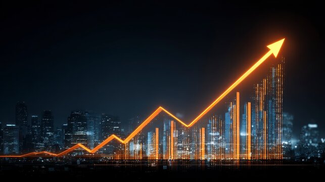 Digital image depicts a glowing orange arrow ascending over a cityscape at night, symbolizing growth and progress