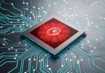Closeup view of a central ai processor on a complex circuit board, with glowing blue and red lines representing data flow and connections, symbolizing advanced technology and artificial intelligence