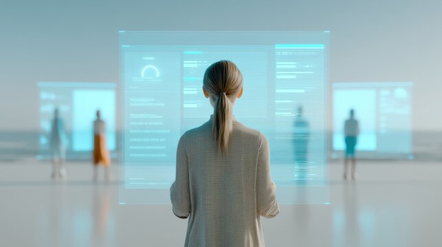A woman interacts with multiple transparent digital screens displaying data and graphs in a futuristic, minimalistic environment.