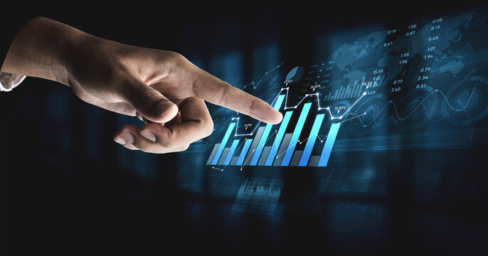 Innovative technology concept with digital data visualization, a finger touches future interface presenting dynamic growth, ideal for modern business strategy and financial analysis
