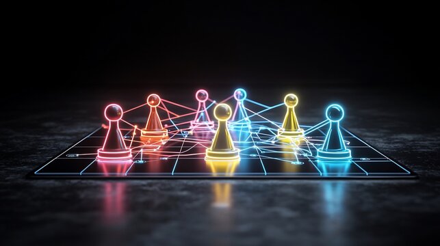 Futuristic neon network of interconnected game pieces on a glossy black background symbolizing digital technological innovation