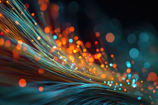 Close-up of glowing fiber optic cables with blurred light orbs in warm and cool tones