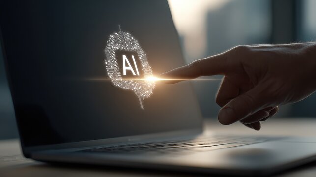 A futuristic robotic hand with illuminated fingertip reaches out, symbolizing technology, innovation, and artificial intelligence.