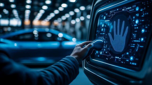 Futuristic handprint recognition technology in a modern automotive showroom with a sleek car background