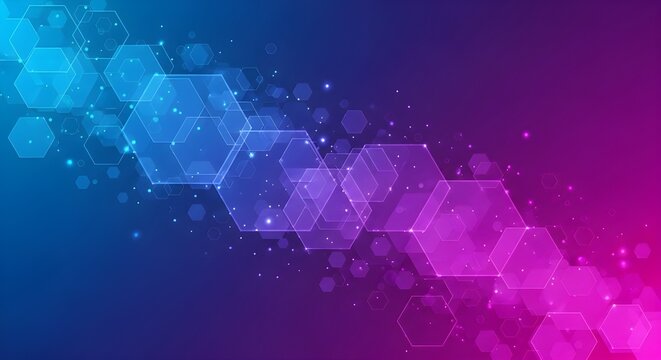 Digital abstract background with glowing translucent hexagonal pattern and gradient from blue to purple showing layered tech elements in modern futuristic style for science and presentation visuals