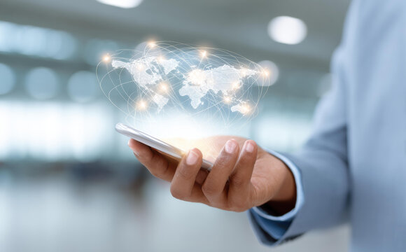Innovative business executive holding smartphone with holographic world map displaying global connection network and international communication technology concept with bright confident futuristic