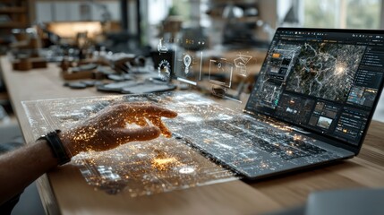 Futuristic holographic map displaying cybernetic interface