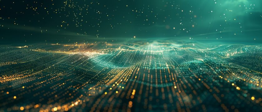 Abstract digital background featuring flowing teal and gold data waves with glowing particles. A futuristic concept representing AI, big data, and advanced technology