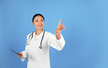 Asian Doctor Woman Using Invisible Touchscreen, Pressing Key With Finger