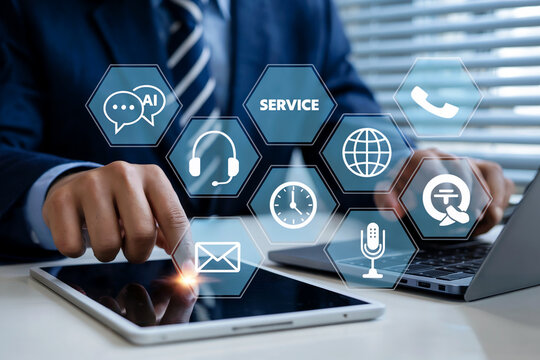 Businessman uses tablet with digital service icons for innovative business technology and customer support solutions