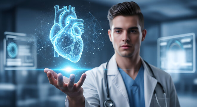 Doctor interacting with holographic interface displaying cardiac data and a 3d heart model, representing future medical diagnostics, health research, and innovative healthcare technology solutions