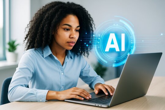 Focused woman using laptop with futuristic AI interface on bright background, symbolizing technology and digital innovation progress.