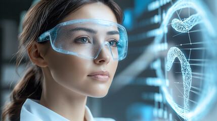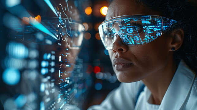 Innovative scientist in biotech lab wearing protective glasses, analyzing AI driven data visualizations. atmosphere is focused and futuristic, showcasing advanced technology