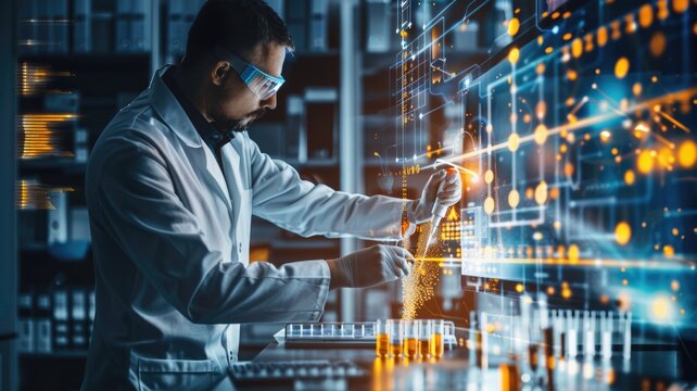 Scientist working in advanced laboratory with digital technology interface