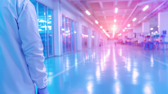 Partial view of scientist in laboratory hallway with high tech equipment and futuristic lighting