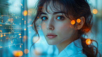 Female scientist analyzing data on computer screen with digital interface