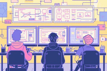 A group of programmers work together in a tech office with multiple monitors, developing and debugging code, fostering a collaborative and innovative environment.