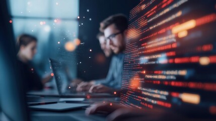 A vibrant team of programmers collaborates in a dimly lit workspace, immersed in coding and creating innovative software solutions together.
