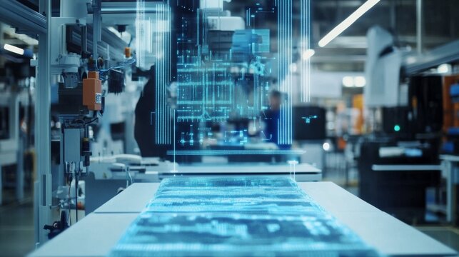A modern office conference room with a digital holographic interface overlay, symbolizing futuristic technology and business collaboration.