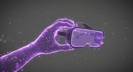 Virtual reality metaverse concept showing a human hand in digital wireframe holding vr headset for gaming experience. Futuristic innovative technology presentation