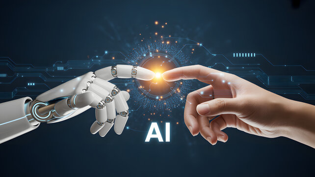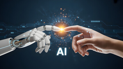 Human-AI Interaction: A stunning image depicting the connection of a human and a robot through a delicate touch, illuminating the promise of technology and its profound impact on humanity.