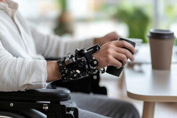 An individual with a high-tech robotic arm engages in everyday life tasks, showcasing the intersection of technology and humanity through assistive innovations and modern robotics.
