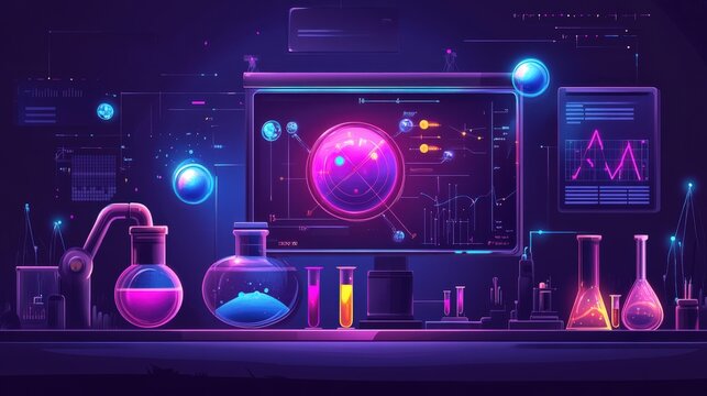 Futuristic Laboratory with Colorful Chemical Experiments and Advanced Technology Displaying Scientific Data, Charts and Graphs in a Vibrant Digital Environment