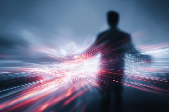 A figure stands against a backdrop of light trails representing data visualization and innovation. This scene captures the essence of interaction in a futuristic environment