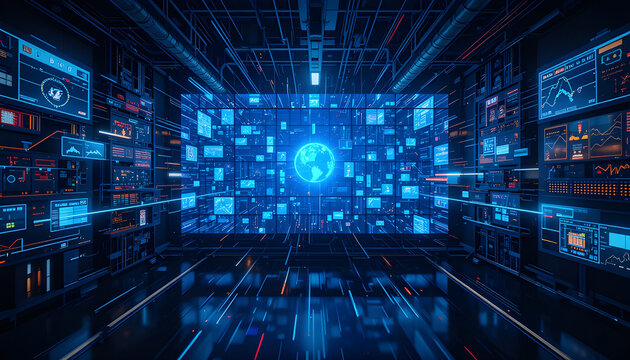 Futuristic data center showcasing advanced technology and global connectivity in a virtual environment