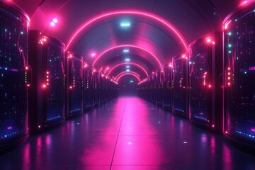 Neon-lit server room with futuristic design showcasing advanced technology and vibrant colors
