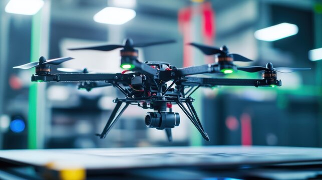 High tech drone equipped with a camera hovering in an innovative production area, highlighting advanced technology and the seamless integration of industrial automation