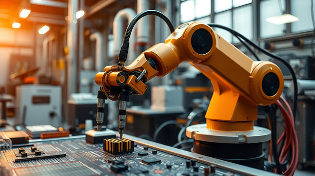 Industrial workspace featuring a robotic arm engaging with circuit boards under warm lighting, highlighting modern technology and innovation