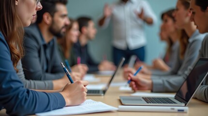 A multicultural team of business people engaged in a creative brainstorming session, working collaboratively on a project. The image highlights teamwork, innovative thinking, and diverse perspectives.