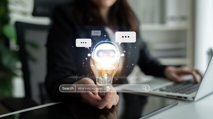 Ai robot contemplates prompt in search bar with bokeh lights background for artificial intelligence and machine learning concepts and future technology