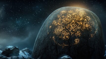 Floating cracked stone orb engraved 2026, showing fissure in cosmic backdrop, amber teal bokeh