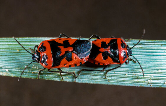 The shield bug (Eurydema ornata), mating bugs on a green plant