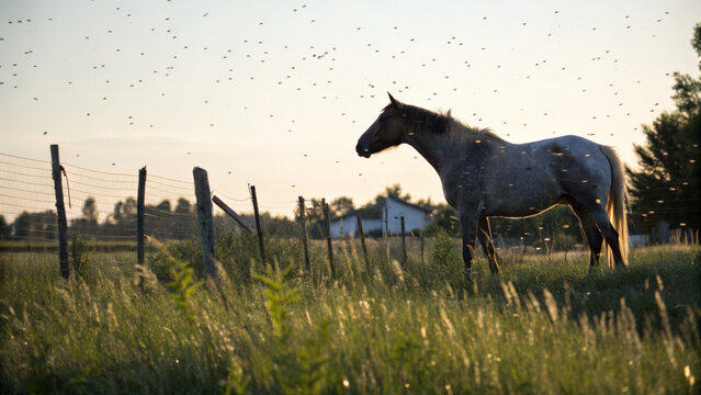 Horse standing on pasture surrounded by insects at sunset. Rural horse on summer field with flying insects. Horse outdoors with mosquitoes and warm sunset light