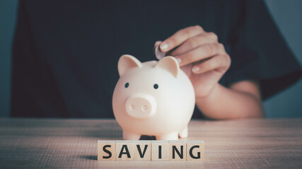 Saving money and investment concept.hand holding coins putting into piggy bank and Saving text from in wood cubes.