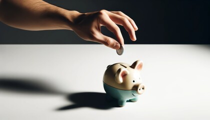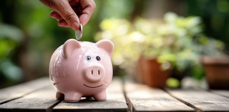 Hand inserting a coin into a pink piggy bank, symbolizing personal savings and financial planning.