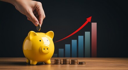 Yellow piggy bank receiving coin with rising bar graph and red arrow saving money