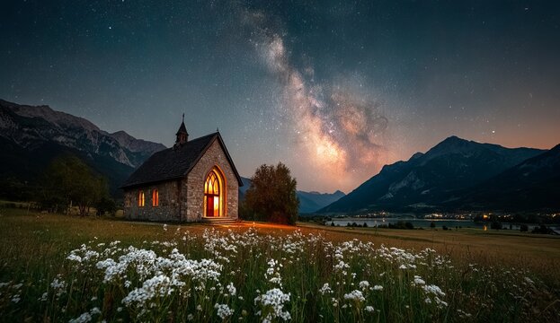 Stone chapel emitting warm light on snow-covered ground at twilight with footprints