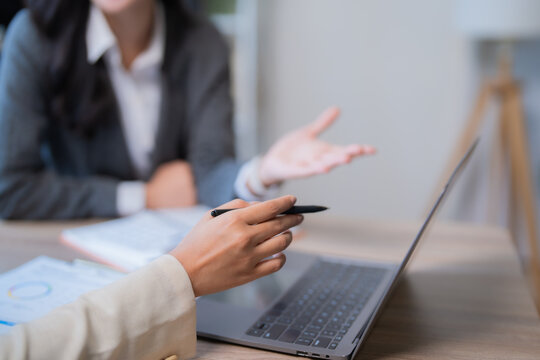 Two businesswomen are having a discussion using a laptop and documents, actively collaborating on a project or sharing insights in a professional setting