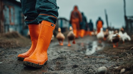 Farmer wearing rubber boots walks through a muddy plowed field at sunset, carefully inspecting crops after the harvest while enjoying the tranquil rural landscape